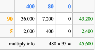 Finally, we add up all the sums we found in step 3 to get our final answer to 480 times 95.