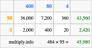 Finally, we add up all the sums we found in step 3 to get our final answer to 484 times 95.