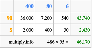 Below is an illustration showing you how to calculate 486 times 95 using the box method, using the instructions above.