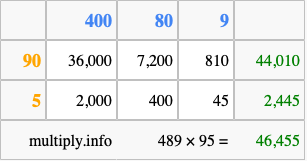Below is an illustration showing you how to calculate 489 times 95 using the box method, using the instructions above.