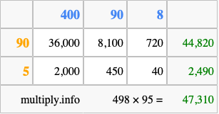 Below is an illustration showing you how to calculate 498 times 95 using the box method, using the instructions above.