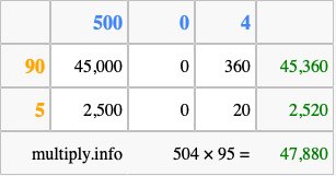 Finally, we add up all the sums we found in step 3 to get our final answer to 504 times 95.
