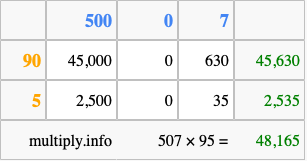 That's all there is to it! As you can see from the box above, the answer to 507 times 95 using the box method is 48,165.
