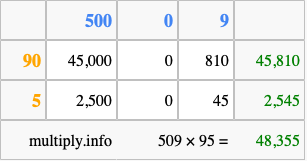 Below is an illustration showing you how to calculate 509 times 95 using the box method, using the instructions above.