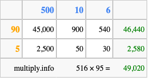 Below is an illustration showing you how to calculate 516 times 95 using the box method, using the instructions above.