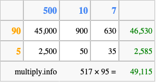 Below is an illustration showing you how to calculate 517 times 95 using the box method, using the instructions above.