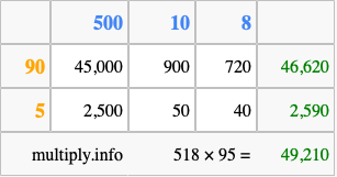 Below is an illustration showing you how to calculate 518 times 95 using the box method, using the instructions above.