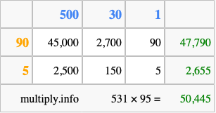 That's all there is to it! As you can see from the box above, the answer to 531 times 95 using the box method is 50,445.