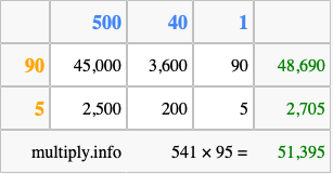 Below is an illustration showing you how to calculate 541 times 95 using the box method, using the instructions above.