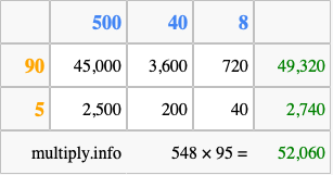 Below is an illustration showing you how to calculate 548 times 95 using the box method, using the instructions above.