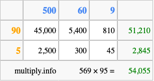 Finally, we add up all the sums we found in step 3 to get our final answer to 569 times 95.