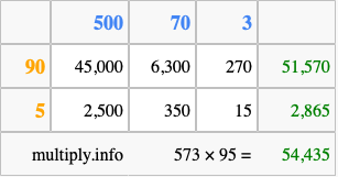 Below is an illustration showing you how to calculate 573 times 95 using the box method, using the instructions above.