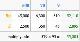 Below is an illustration showing you how to calculate 579 times 95 using the box method, using the instructions above.