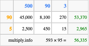 Below is an illustration showing you how to calculate 593 times 95 using the box method, using the instructions above.