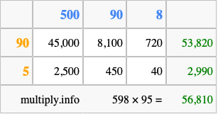 Below is an illustration showing you how to calculate 598 times 95 using the box method, using the instructions above.