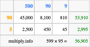 Below is an illustration showing you how to calculate 599 times 95 using the box method, using the instructions above.