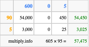 Finally, we add up all the sums we found in step 3 to get our final answer to 605 times 95.