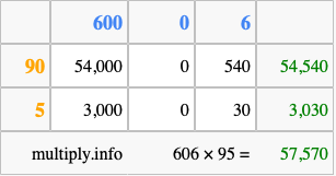 Below is an illustration showing you how to calculate 606 times 95 using the box method, using the instructions above.