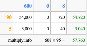 Finally, we add up all the sums we found in step 3 to get our final answer to 608 times 95.