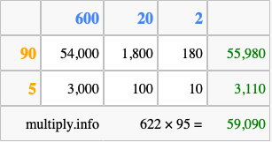 Below is an illustration showing you how to calculate 622 times 95 using the box method, using the instructions above.