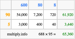 Finally, we add up all the sums we found in step 3 to get our final answer to 688 times 95.