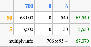 Finally, we add up all the sums we found in step 3 to get our final answer to 706 times 95.