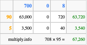 Below is an illustration showing you how to calculate 708 times 95 using the box method, using the instructions above.