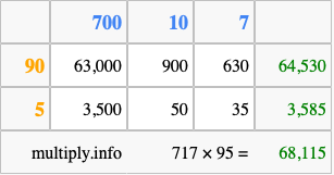 Below is an illustration showing you how to calculate 717 times 95 using the box method, using the instructions above.