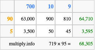 Below is an illustration showing you how to calculate 719 times 95 using the box method, using the instructions above.