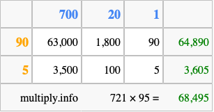 Finally, we add up all the sums we found in step 3 to get our final answer to 721 times 95.