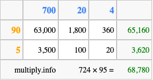 Finally, we add up all the sums we found in step 3 to get our final answer to 724 times 95.