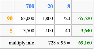 Finally, we add up all the sums we found in step 3 to get our final answer to 728 times 95.