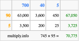 Finally, we add up all the sums we found in step 3 to get our final answer to 745 times 95.