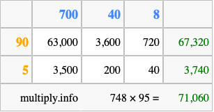 Below is an illustration showing you how to calculate 748 times 95 using the box method, using the instructions above.