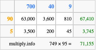 Below is an illustration showing you how to calculate 749 times 95 using the box method, using the instructions above.