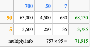 Finally, we add up all the sums we found in step 3 to get our final answer to 757 times 95.