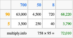 Below is an illustration showing you how to calculate 758 times 95 using the box method, using the instructions above.