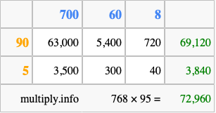 Finally, we add up all the sums we found in step 3 to get our final answer to 768 times 95.