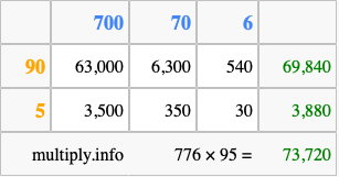 Below is an illustration showing you how to calculate 776 times 95 using the box method, using the instructions above.
