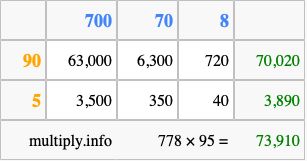 Below is an illustration showing you how to calculate 778 times 95 using the box method, using the instructions above.