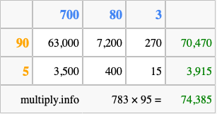 Finally, we add up all the sums we found in step 3 to get our final answer to 783 times 95.