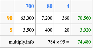 Finally, we add up all the sums we found in step 3 to get our final answer to 784 times 95.