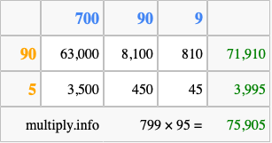 Below is an illustration showing you how to calculate 799 times 95 using the box method, using the instructions above.
