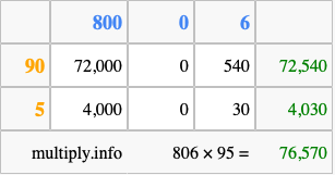 Below is an illustration showing you how to calculate 806 times 95 using the box method, using the instructions above.