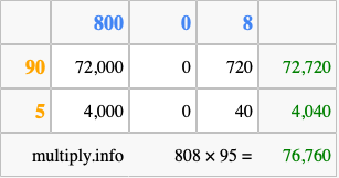 Finally, we add up all the sums we found in step 3 to get our final answer to 808 times 95.