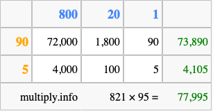 That's all there is to it! As you can see from the box above, the answer to 821 times 95 using the box method is 77,995.