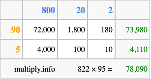 Finally, we add up all the sums we found in step 3 to get our final answer to 822 times 95.