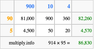 Below is an illustration showing you how to calculate 914 times 95 using the box method, using the instructions above.