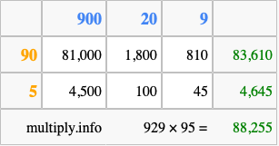 That's all there is to it! As you can see from the box above, the answer to 929 times 95 using the box method is 88,255.