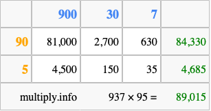 Below is an illustration showing you how to calculate 937 times 95 using the box method, using the instructions above.